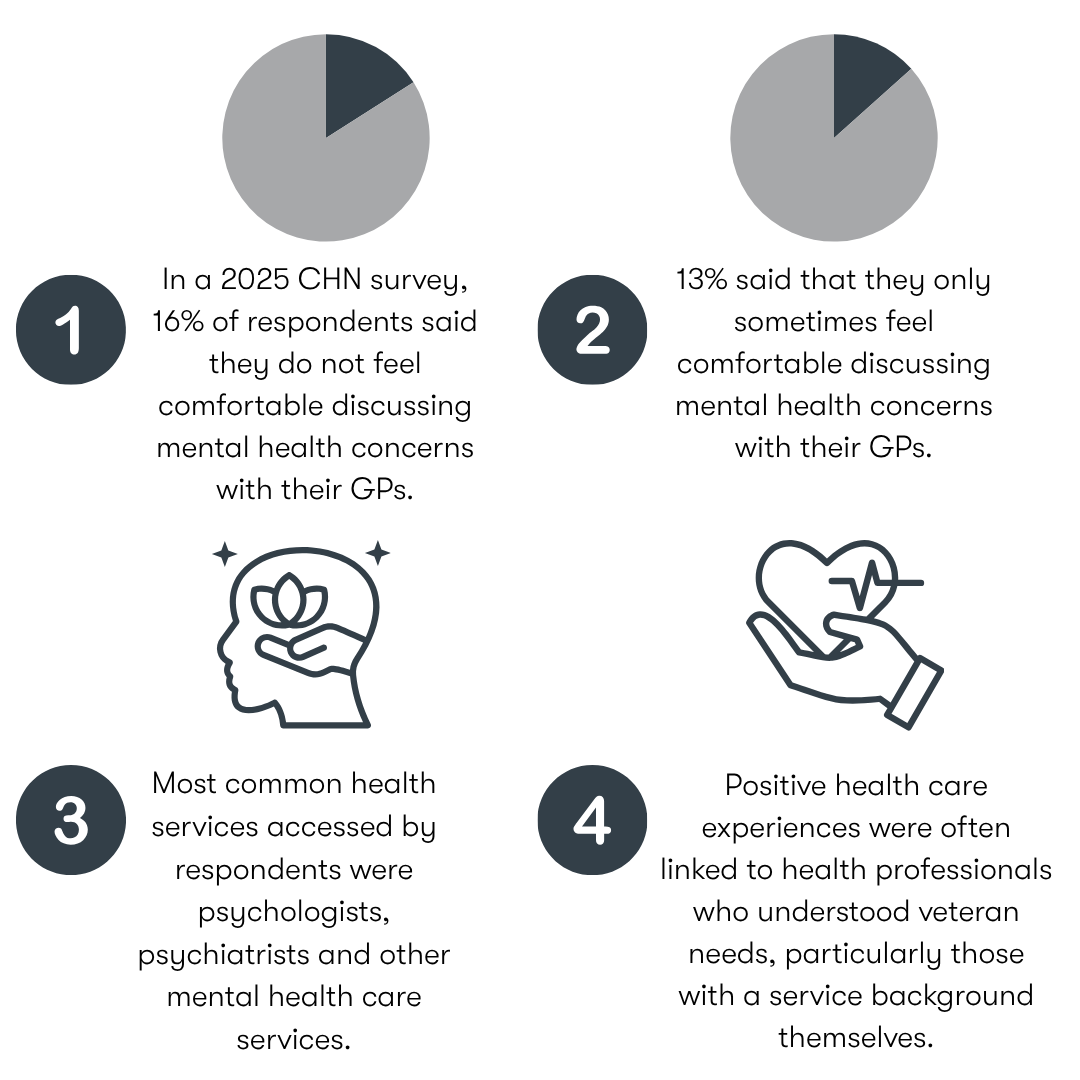 Last year, CHN conducted a survey to better understand the needs of our veterans when accessing health care. CHN shared the survey findings with the Department of Veterans’ Affairs and health organisations in the ACT which may help inform policies and procedures that improve health outcomes for our veterans. We also highlighted the Coordinated Veterans Care Program in communications and hosted a General Practice Education Event in 2025. Our survey findings showed that mental health was a critical area of concern, with 16% of respondents saying they do not feel comfortable discussing mental health concerns with their GP, and 13% saying that they only sometimes feel comfortable discussing this. While some of the most common health services accessed by respondents were Psychologists and Psychiatrists and other mental health care services, a significant number of respondents said they need better mental health support. This includes more available services, enhanced appropriate diagnosis, better continuity of care and comprehensive plans to improve ongoing health management.